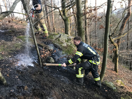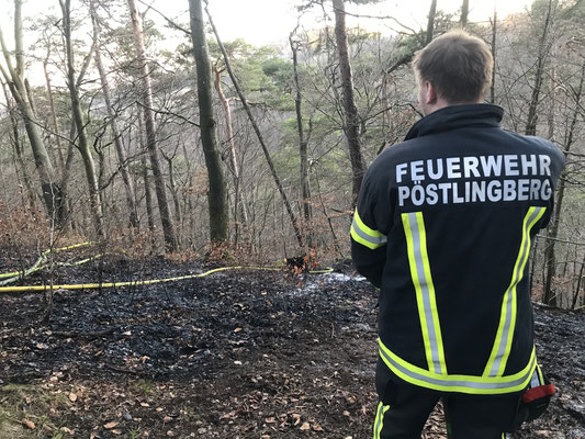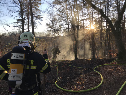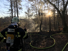 Am Wanderweg des Bachlbergs hatte eine Fläche von über 300 Quadratmetern zu brennen begonnen. Gemeinsam mit der Berufsfeuerwehr Linz haben wir den Brand bekämpft.